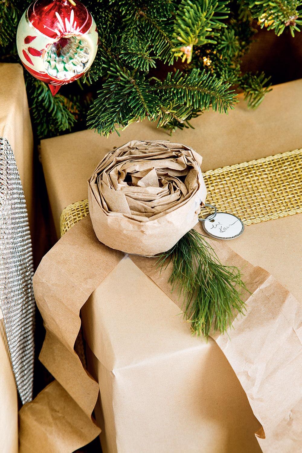 In lieu of a ready-made bow, try your hand at the rustic rosette that Bertelsen used to dress this pretty present. Fold a two-foot by threeinch strip of kraft paper lengthwise, creating three accordion-style one-inch folds. Roll the folded strip to create a coil, then attach the loose end to the outside of the coil with clear tape. Affix the rosette to a wrapped gift, and give it pride of place under the tree!
