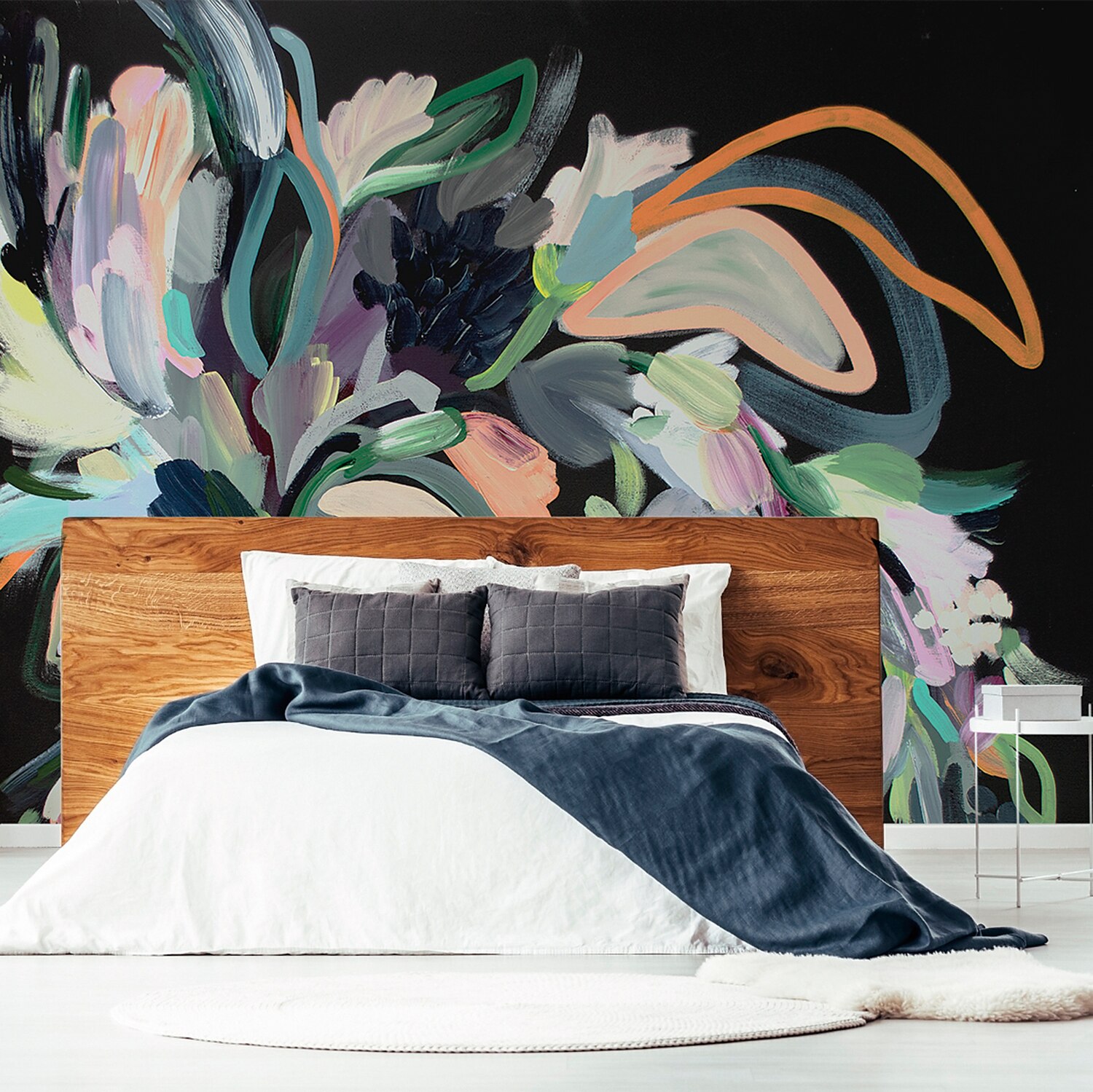 Artsy flowers on a dark background offer up a majestic and mysterious atmosphere. Paired with a rustic wood headboard and cozy neutral-hued bedding, the dramatic wall is the standout piece in this room.