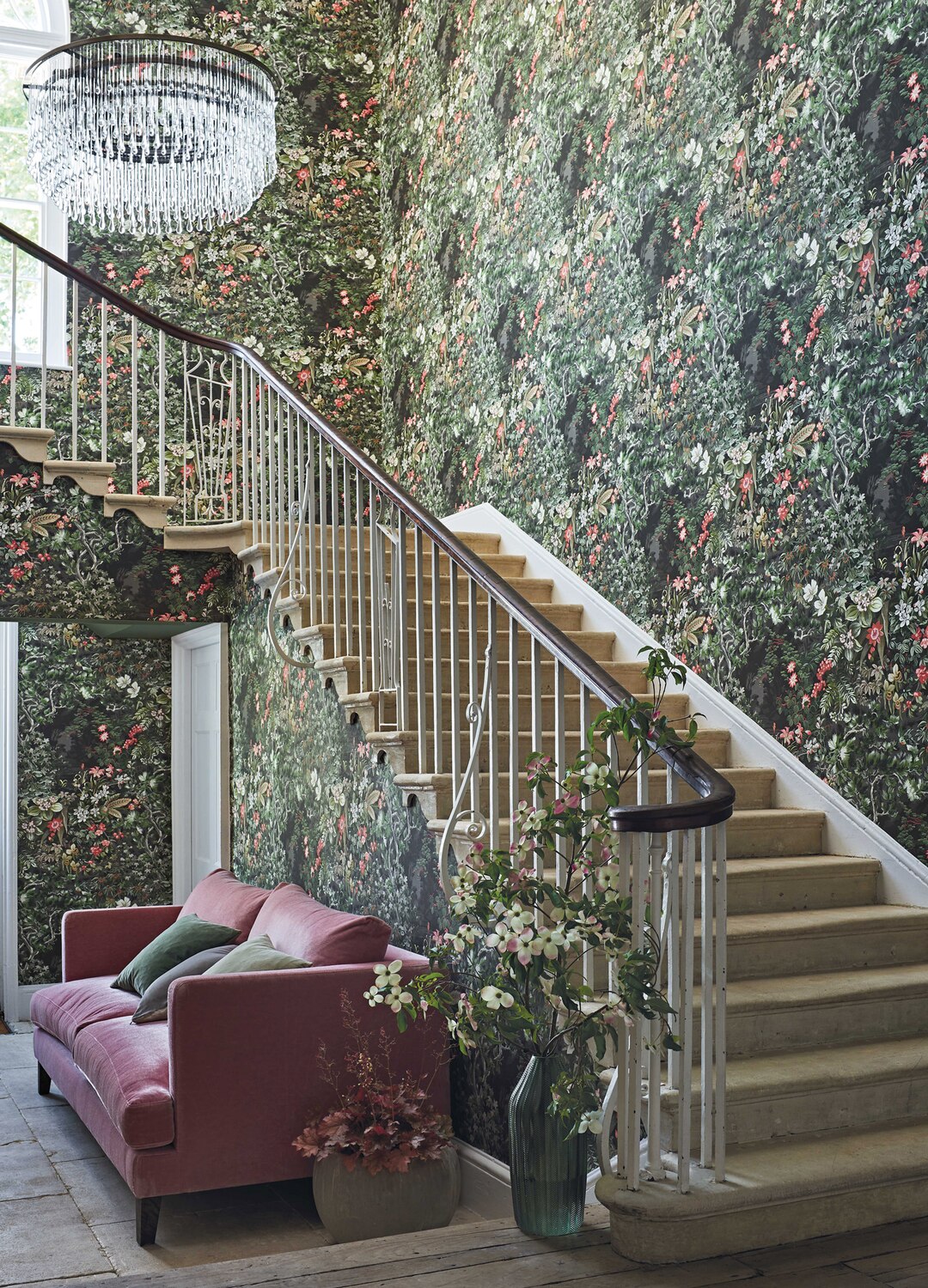 Dressing all the walls of your entryway or stairwell (or both!) with flower-printed wallpaper provides a calming aesthetic that has you feeling like you’re strolling through the English countryside. Indoor flowering plants inspired by the pattern on the walls reinforce the