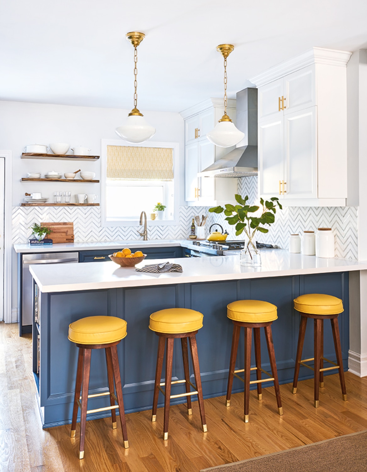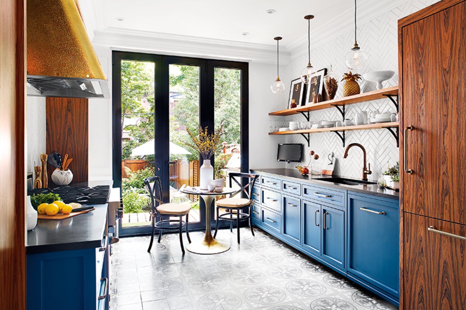 A beautiful melody of colour, pattern and texture, this bistro-style kitchen is chock-full of personality. The blue cabinetry with brass hardware and open shelving with iron brackets play up the trademark of a French bistro perfectly. Oh, and that glamourous vent has got us wanting to stand in front of the stove to cook up a storm all day.