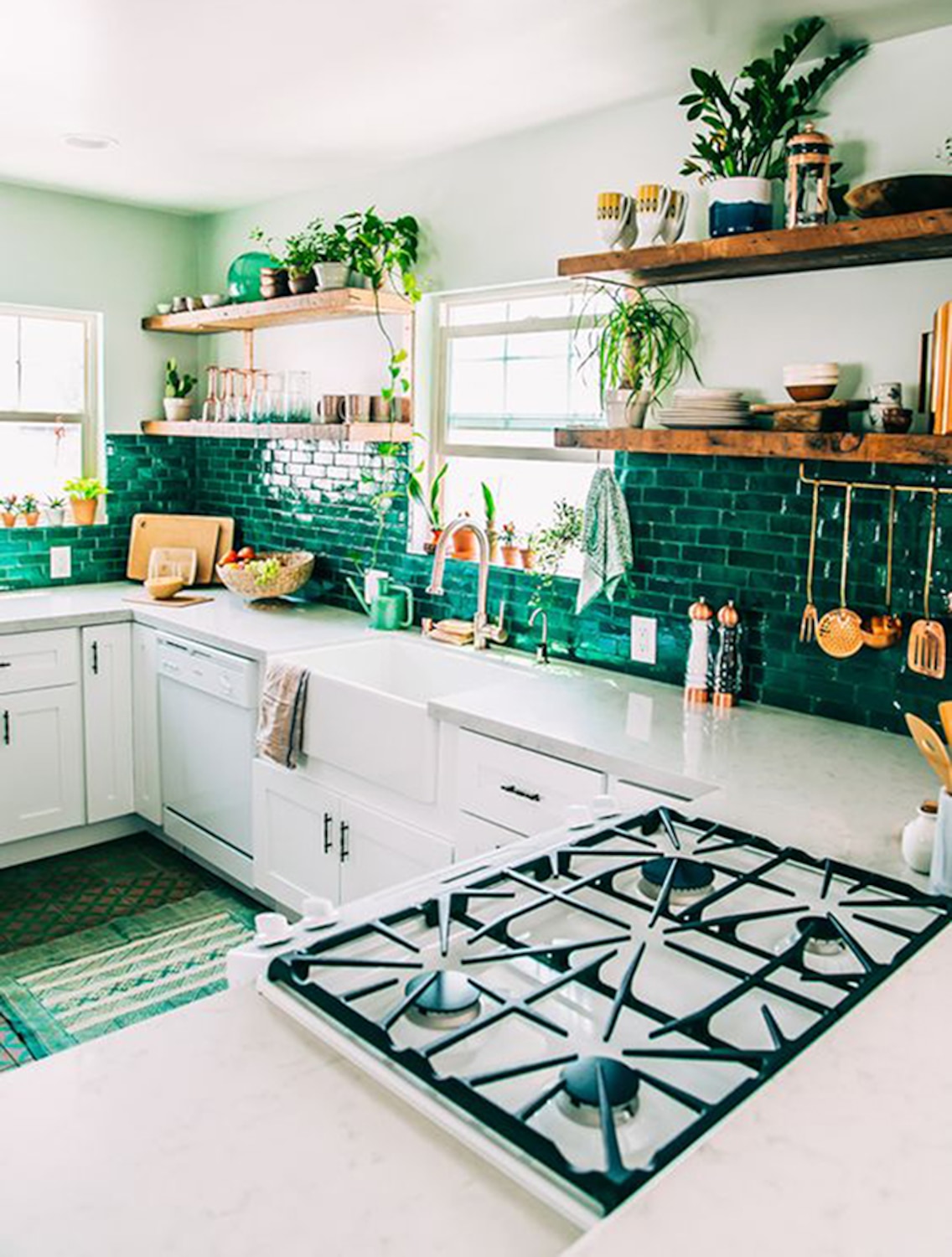 For those with a green thumb or just a general plant obsession, this kitchen design is for you. The emerald-green backsplash contrasts beautifully with the wood open-shelving, and all those brass details really bring this kitchen together.
