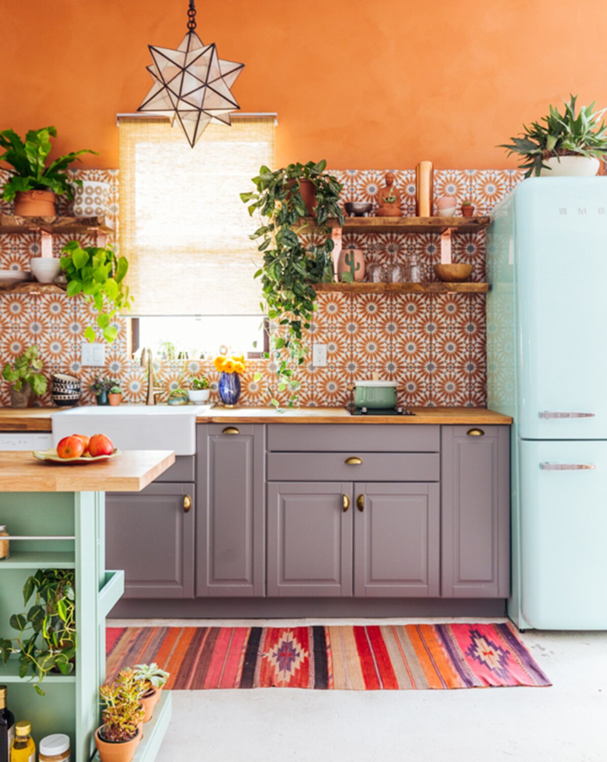 The beautiful balance of colour, pattern and plants throughout Justina Blackeney's studio kitchen makes an impactful statement while also retaining its quirky charm.