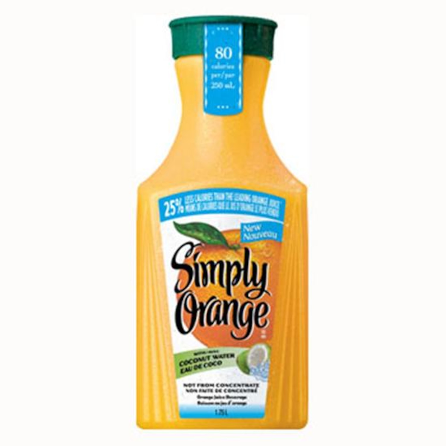 This orange juice beverage has 80 calories per serving and 25% less calories than the leading orange juice. Simply Orange with Coconut Water is never concentrated, never sweetened and has no preservatives.