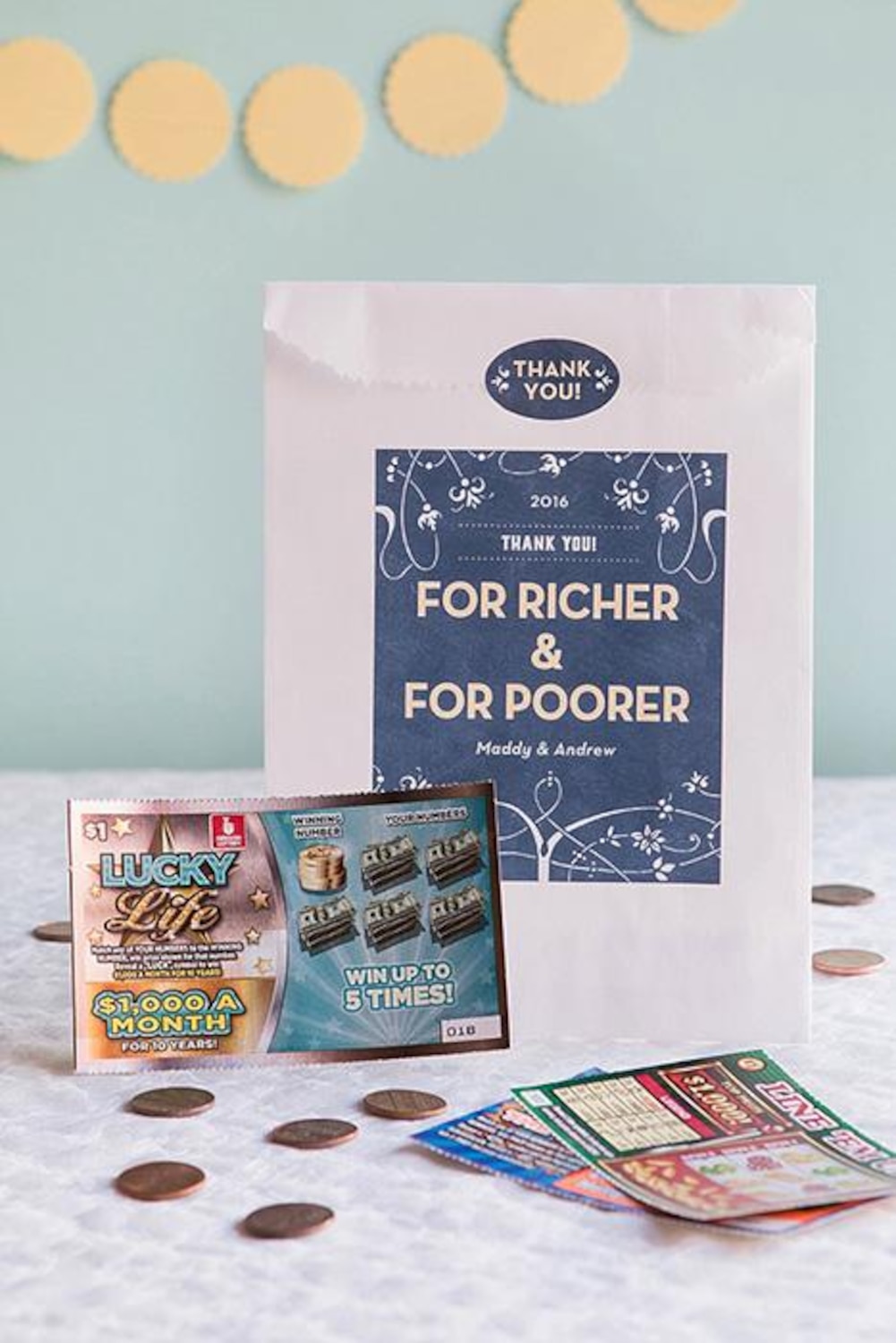 We can guarantee that everyone at your wedding (who's over the age of 18, at least) will love you forever if you give them this favour. Pack a quick-scratch lotto card in a paper bag and label it "For Richer or Poorer." We'll leave it up to you whether you request a percentage of any winnings (we're joking... kind of).