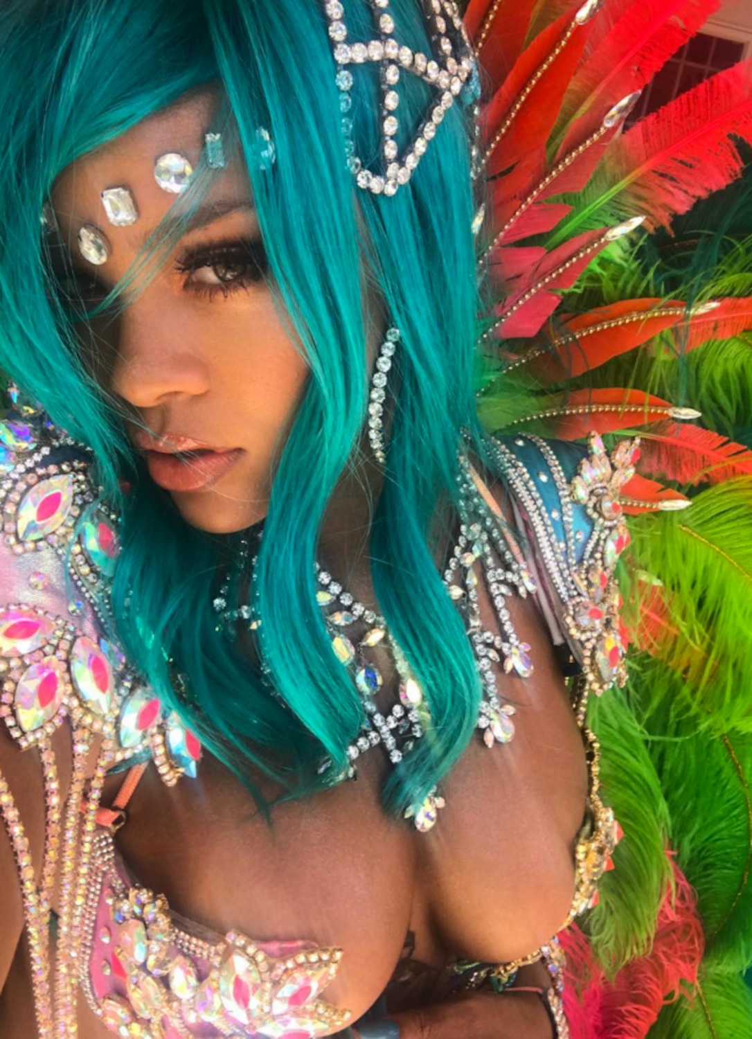 Rihanna debuted her turquoise-coloured hair at the Barbados Carnival this year and we love it. Her hair added the perfect pop of colour to her sparkling costume.