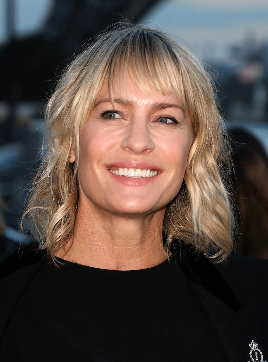 Wright has grown out the pixie cut into a trendy wavy long bob with a textured fringe.