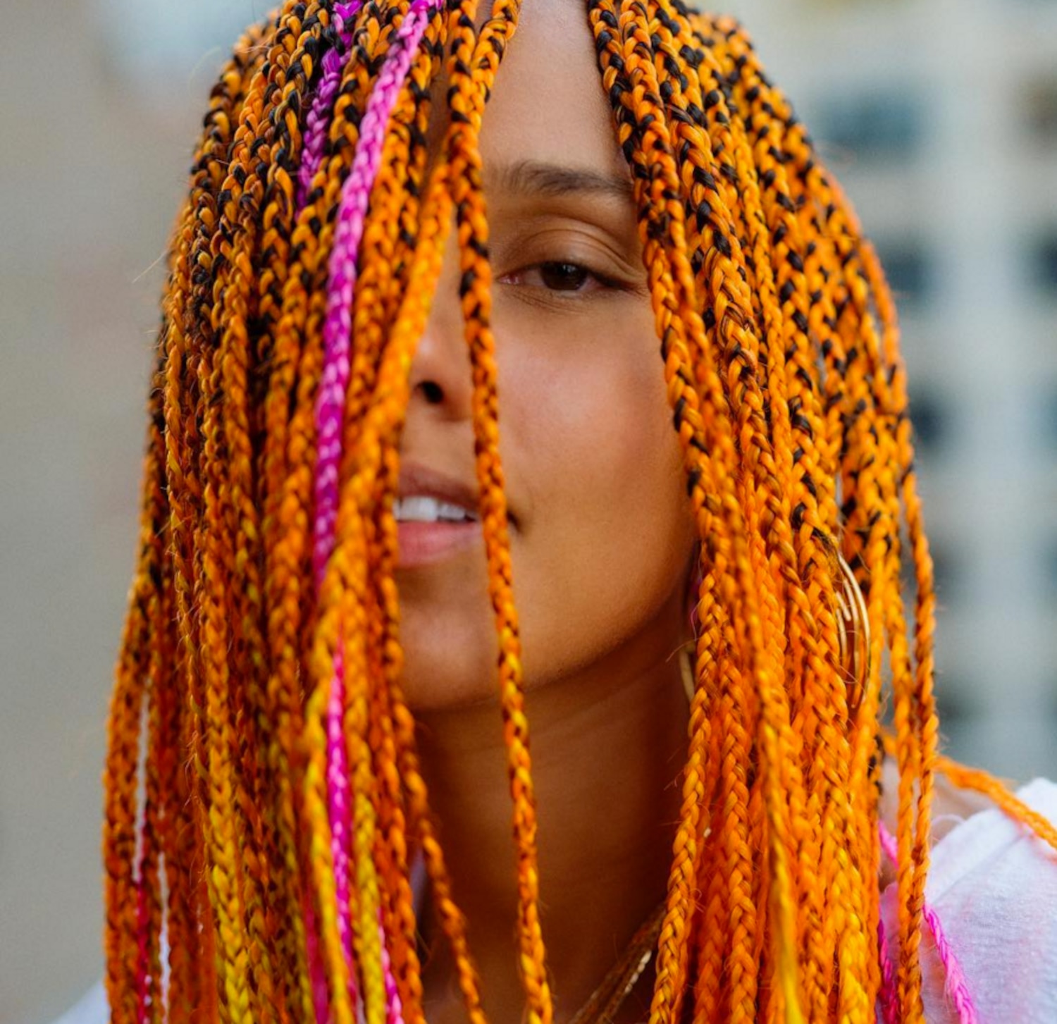 Do we love it or do we love it? Alicia Keys shocked and excited the masses when she posted photos of her braids on Instagram. The bright orange and pink single braids are a great way to protect her natural hair and they look fantastic. We definitely love it!