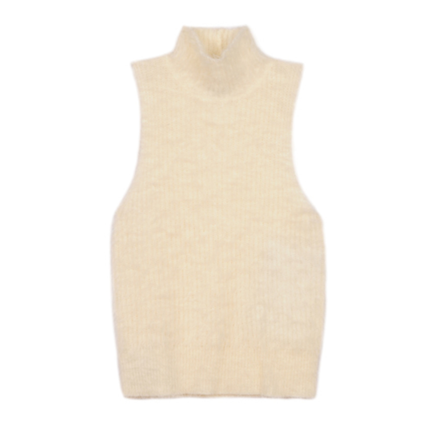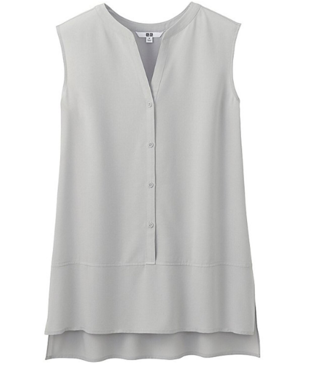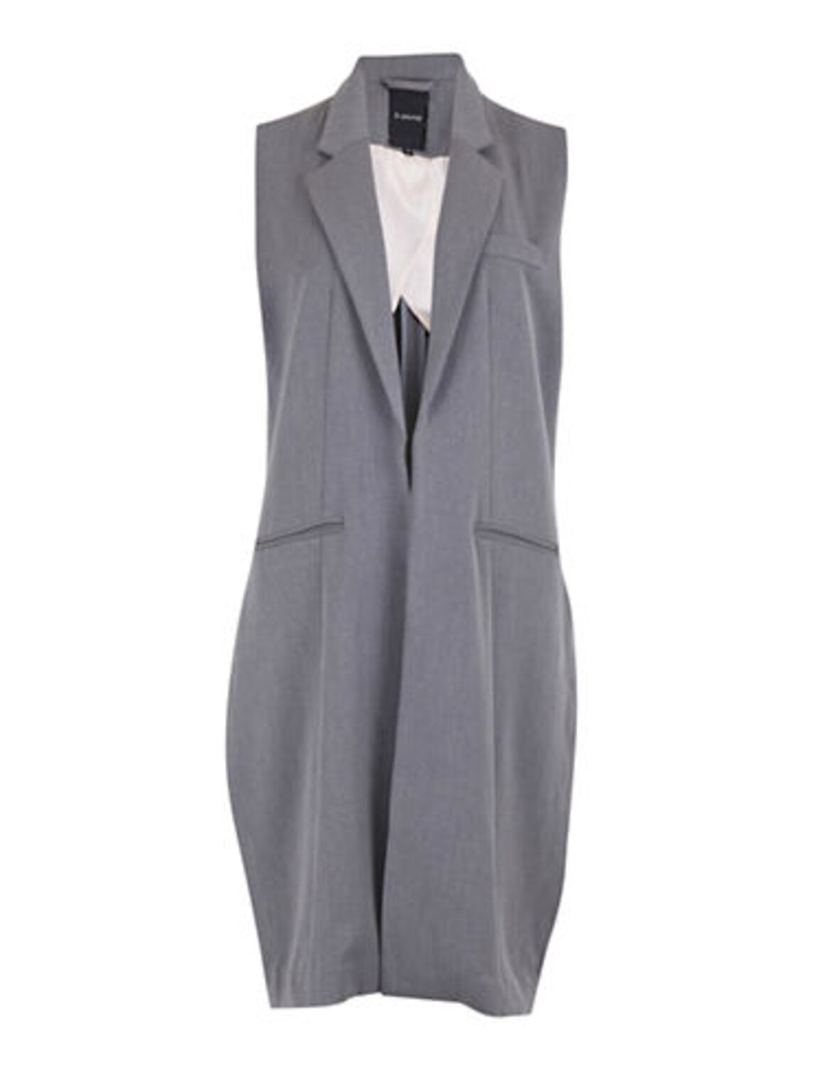 Regardless of your shape or size, sleeveless tops and dresses require excellent fit. If they're too big, armholes can reveal undergarments; if they're too tight, they look awkward and uncomfortable. For Jenny, we picked a neoprene-like dress with a high neckline. We added structure, and a little more coverage, by topping it with a sleeveless vest dappled with brooches which add interest—and keep the focus away from the upper arms.